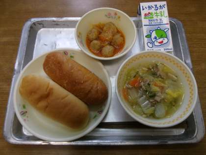 今日の給食は「ミニパン・揚げパン,牛乳,肉団子のケチャップ煮,はくさいスープ」でした。