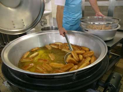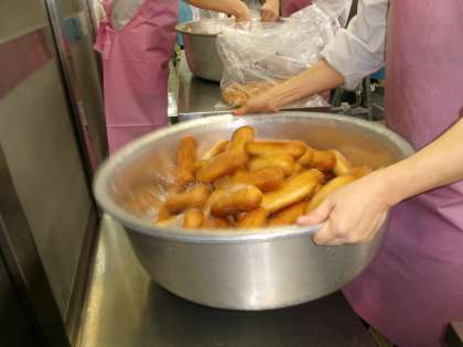 揚げパンは子どもたちに人気の給食です。ミニパンを給食場の大きな釜でカリッと揚げます。揚げたてアツアツのうちにグラニュー糖をまぶします。揚げパンを,大きな容器に入れて勢いよく振りながらまぶす作業は難しいです。