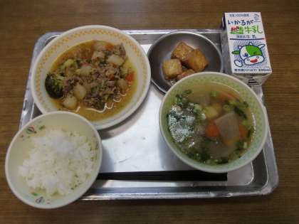 今日の給食は「ごはん,牛乳,豚肉とカブのピリ辛煮,厚揚げ田楽,のっぺい汁」でした。