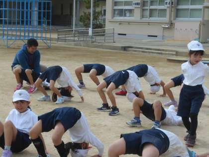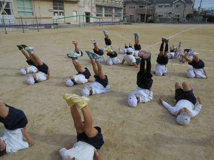 6年後の組体操をイメージしながら,バランスや体幹を鍛える運動をしています。