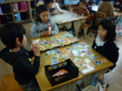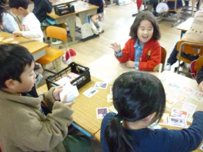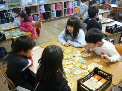 コマ回しに続き,かるた遊びに慣れ親しんでいます。読む人,取る人に分かれて班で楽しみました。