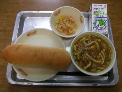 今日の給食は「コッペパン,牛乳,カレーうどん,大根サラダ,手作りドレッシング」でした。