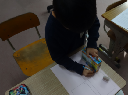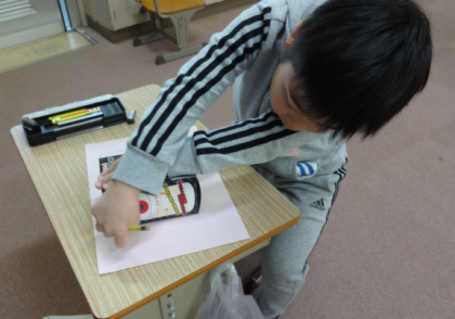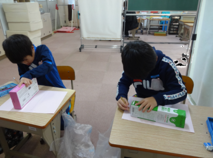 『はこの形』の学習です。箱の面を、紙にうつしとっています。