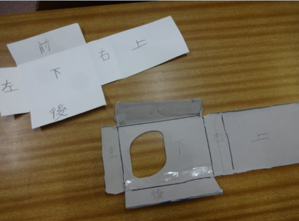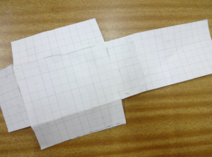 方眼用紙で長方形を作図し、面をならべ、組み立てて箱をつくりました。「上」「下」など、面に書き込む練習をしていくうちに、「分かった!ここは『上』や!」と、頭の中で組み立てをイメージできるようになっていました。