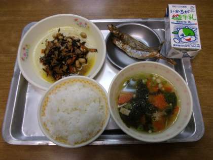 今日の給食は「ごはん,牛乳,焼きししゃも,大豆の磯煮,すまし汁」でした。