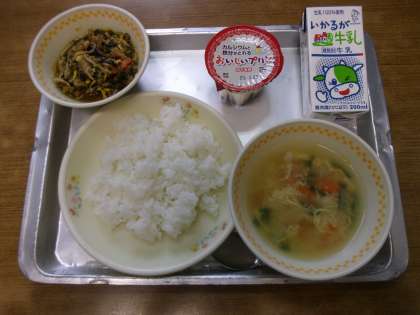 今日の給食は「ごはん,牛乳,ビビンバ風,にらたまスープ,プリン」でした。