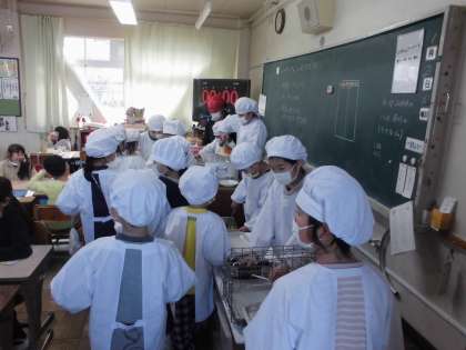 給食当番は自分の役割を進めて学級の給食の準備を進めてます。