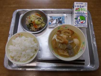 今日の給食は「ごはん,牛乳,味噌おでん,浅漬けサラダ,小魚の佃煮」でした。