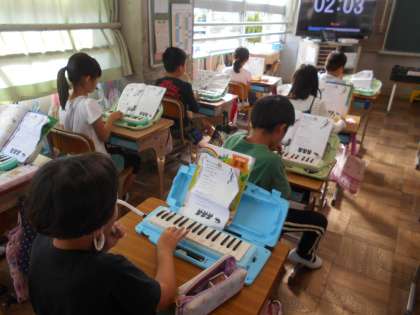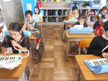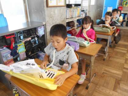 3拍子のリズムをタンブリンやカスタネットで楽しみました。鍵盤の練習もがんばっています。