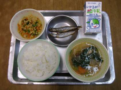 今日の給食は「ご飯,牛乳,焼きシシャモ,スタミナ納豆,さつま汁」でした。
