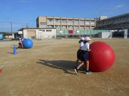 今日は大玉ころがしの練習をしました。大きな玉があっちに行ったりこっちに行ったり…。ペアの子と協力して取り組みます。