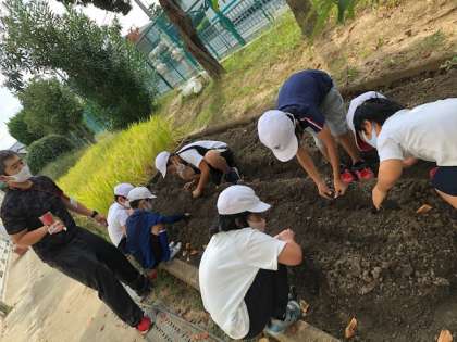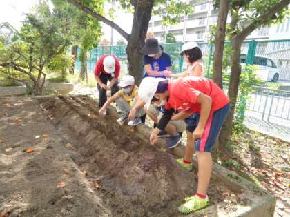 今日のなかよしタイムは,冬野菜の種まきとハロウィンの飾り作りを平行して行いました。冬野菜は二十日大根と春菊の種をまきました。種をまいた後は,優しく土を被せました。