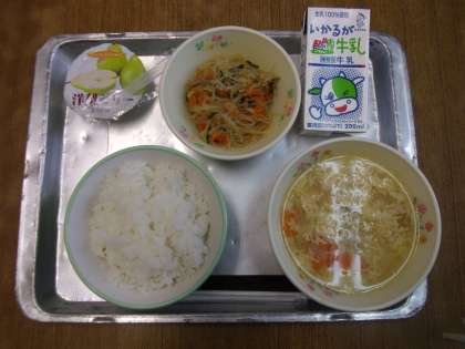 今日の給食は「ご飯,牛乳,春雨の炒め煮,中華コーンスープ,フルーツゼリー(洋ナシ)」でした。