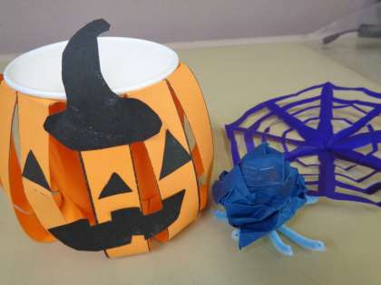 紙コップと橙色ケント紙などを使って,カボチャを作り,黒色ケント紙で目・口・鼻などの表情をつけました。