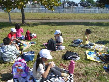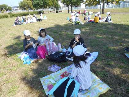 楽しみにしていたお弁当の時間です。1年生も一緒に,班で食べました。