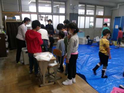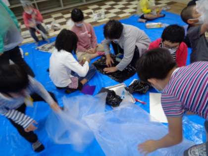 ハロウィンパーティーのための衣装作りをしました。鬼や猫,ジャックオランタンなどの仮面や服を作りました。
