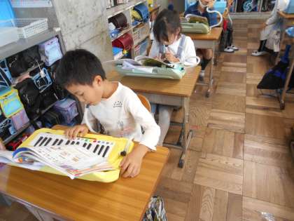 鍵盤の練習をしました。「山のポルカ」では,曲の途中で指の位置を変えないといけないので,苦戦しています。がんばれ!!!
