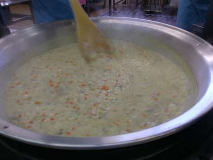 今日の給食は「ご飯,牛乳,クリームシチュー,山菜と野菜のサラダ,手作りドレッシング」でした。