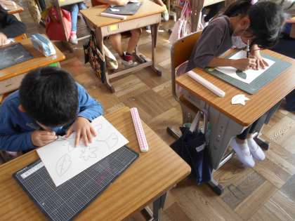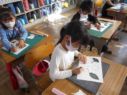 「光のプレゼント」の学習に向けて,アートナイフの使い方を学習しました。今日は練習で,いろいろな葉の形を切り取りました。集中して取り組めました。
