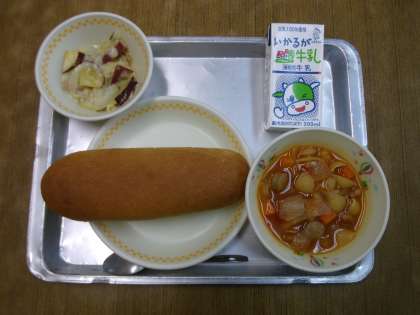今日の給食は「コッペパン,牛乳,さつま芋のグラタン,ミネストローネ」でした。