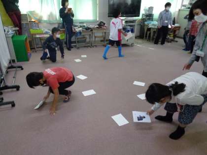 トランプの「神経衰弱」のように,床に並べてあるカードをめくって,お題のカード3枚を集めます。早く3枚そろったチームが勝ちです。グループで相談して順番を決めたり,うまく揃うように協力しながら声かけをしたりしていました。