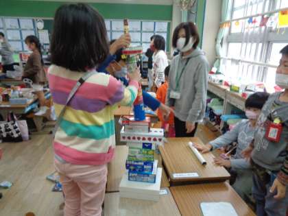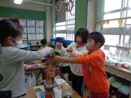 もってきた箱を転がしたり、積んだりしながら形について考えました。