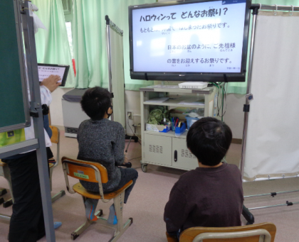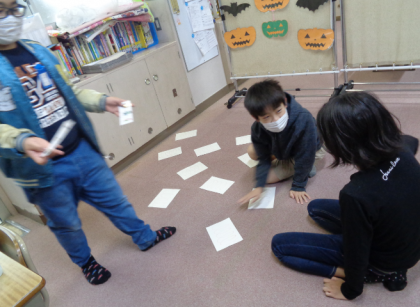 先日のなかよしタイム「ハロウィンパーティー」に参加できなかった児童にも、自立活動の時間を使って、ハロウィンの起源についてのお話をしたり、カード集めゲームをしたりしました。カード集めゲームは、先日参加していた児童にルール説明をお願いしました。相手に分かりやすいように、上手に伝えていました。