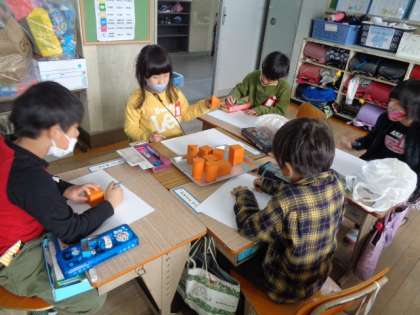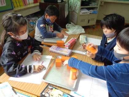 つつの形、箱の形、ボールの形の面を写し取って、絵を描きました。いろいろな形を使って上手に描いていました。