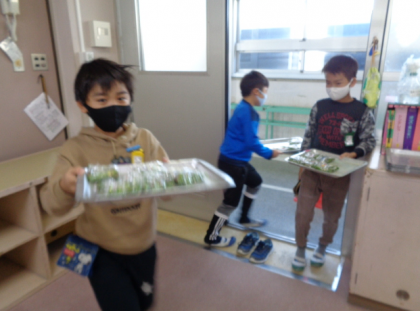 こんなに沢山!間引き菜として料理にも使えるので、持ち帰りました。運ぶのを手伝ってくれています。