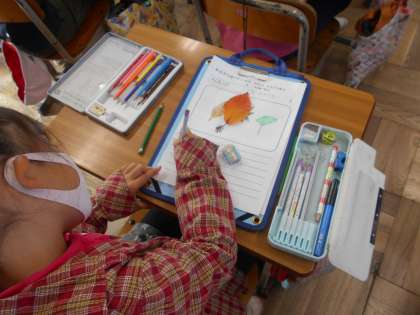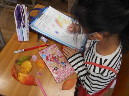色に注目して観察しました。拾った葉を触ってみたり,においをかいだりして詳しく記録することができました。
