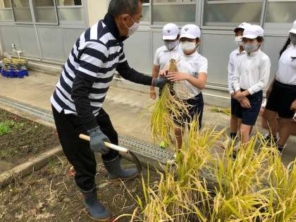 5年生が,田植えや水やりなどをして学習園の稲を育ててきました。