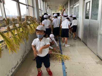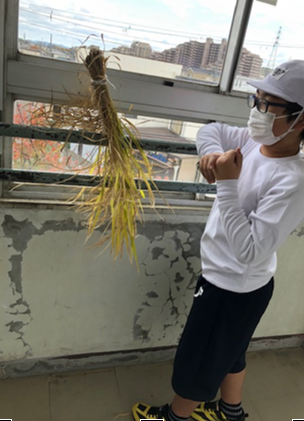 刈り取った稲をひもで束ねて,東校舎3階の窓際の手すりに干していきました。