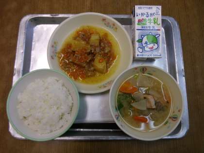 今日の給食は「ご飯,牛乳,揚げじゃがのそぼろかけ,石狩汁」でした。