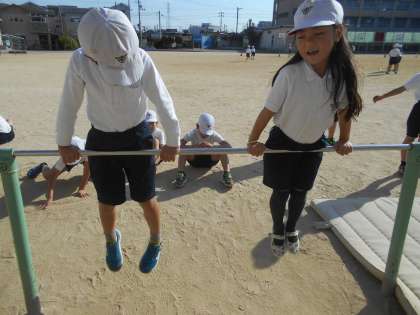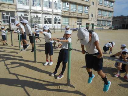 まずは鉄棒を楽しみました。ペアで様々な動物になりきってジャンケンです。