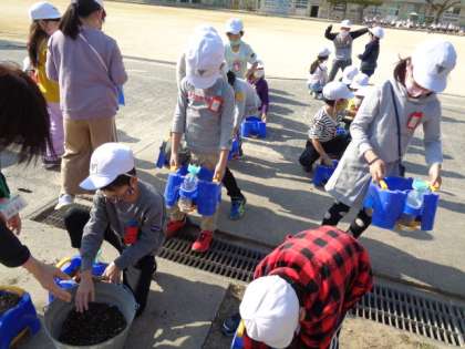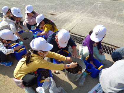 チューリップの球根を一人二つずつ植えました。早く咲いてほしいと思います。