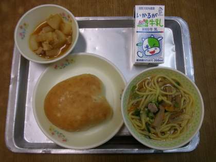 今日の給食は「おさつパン,牛乳,ピリ辛大根,しょうゆラーメン」でした。