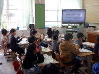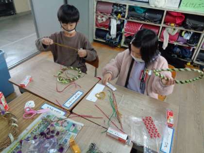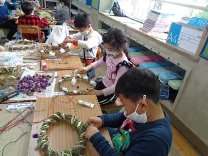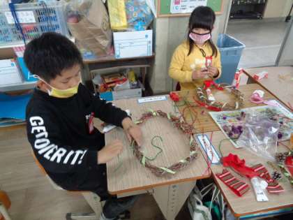 アサガオのリースに飾りをつける飾りつけをしました。ボンドをつけるのに少し苦労しながらも楽しみながらしていました。