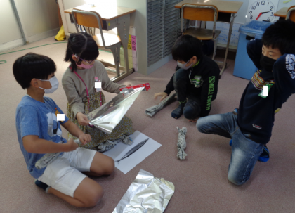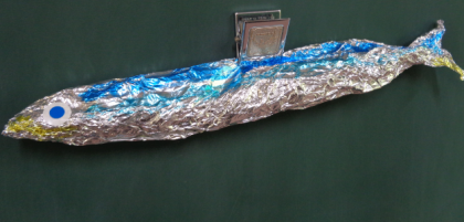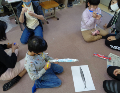 くしゃくしゃにした新聞紙を細長く丸め、アルミホイルで包んで完成!色を塗ったり、シールを貼って目玉をつけたりしました。釣り竿もつくったので、魚釣りごっこもしました。
