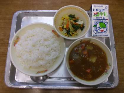 今日の給食は「ご飯,牛乳,カレーライス,小松菜サラダ」でした。