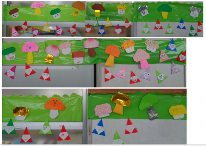 秋の製作で作ったきのこと、冬の製作で作ったサンタクロースを掲示しました。表情や模様が一人ひとり違い、にぎやかで楽しい雰囲気になりました。ぜひ懇談の際にご覧ください。