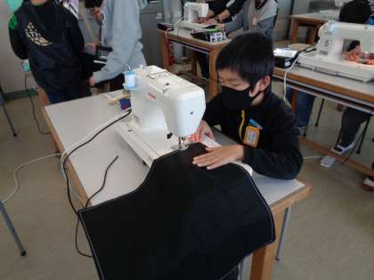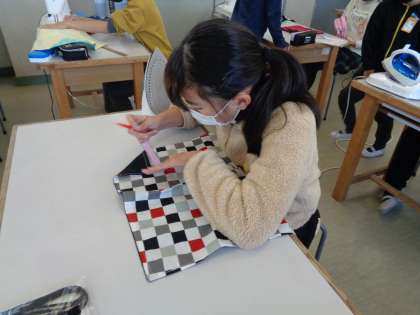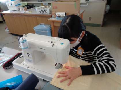 ミシンでお弁当つつみ作りも大詰めです。みんな上手に縫えました。