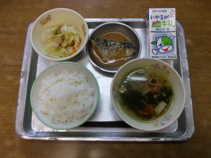今日の給食は「ご飯,牛乳,鯖のみそ煮,キャベツのゴマ酢かけ,すまし汁」でした。