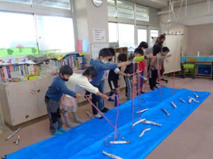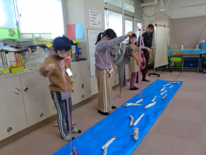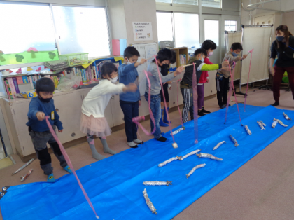 その後は、先日の製作で作ったさんまを使って、魚釣りをしました。海の中(ブルーシート上)に入らないよう、手を伸ばして釣っていました。制限時間は40秒!低学年は自由に釣り、中学年は少しレベルを上げ、海の幅を広くして釣りました。