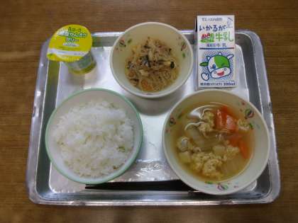 今日の給食は「ご飯,牛乳,チャプチェ,キムチスープ,フルーツゼリー(柑橘)」でした。