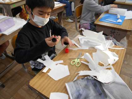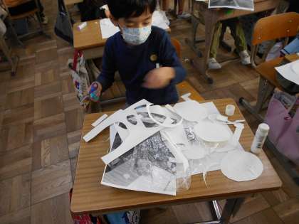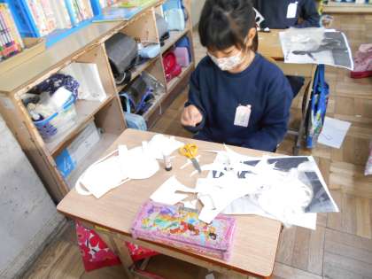 学校での様子を表した紙版画が、次第に仕上がっています。版画を刷る日は、汚れてもいい黒っぽい服で登校させてください。