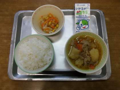 今日の給食は「ご飯,牛乳,肉じゃが,大根サラダ,塩麹ドレッシング」でした。