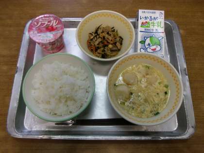 今日の給食は「ご飯,牛乳,鉄分たっぷり煮,むらくも汁,ヨーグルト(いちご)」でした。