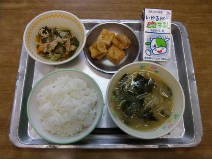 今日の給食は「ご飯,牛乳,大阪しろ菜と豚肉の炒め煮,厚揚げのみぞれがけ,みそ汁」でした。