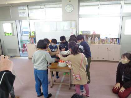 最後に,ろうそくの火がついたケーキを手であおいで消しました。