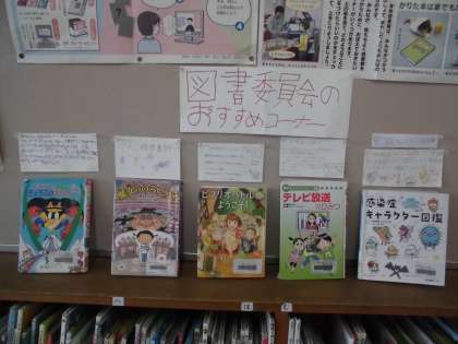 図書委員さんからのおすすめの本を、図書室の絵本の棚の上に展示しています。